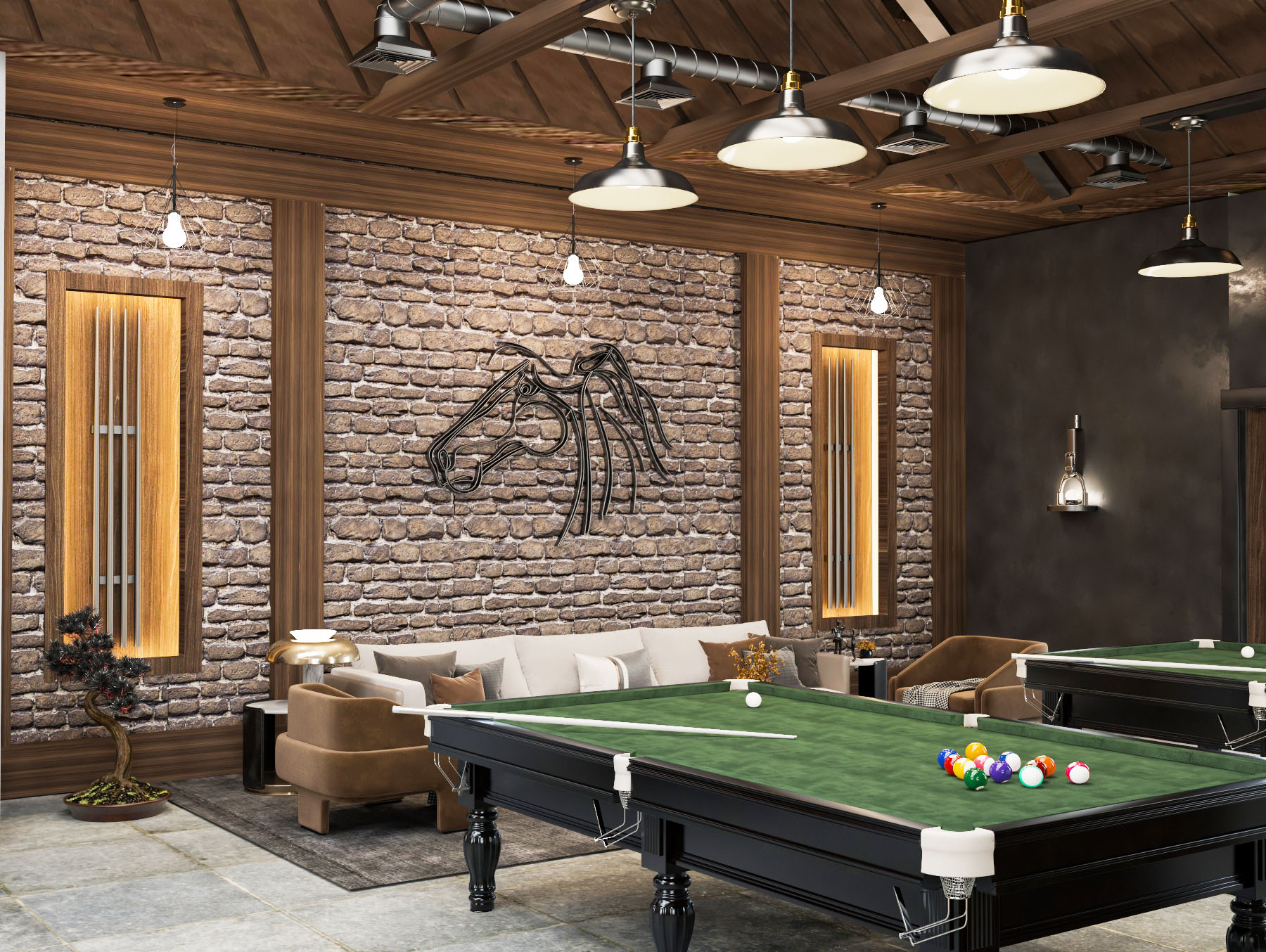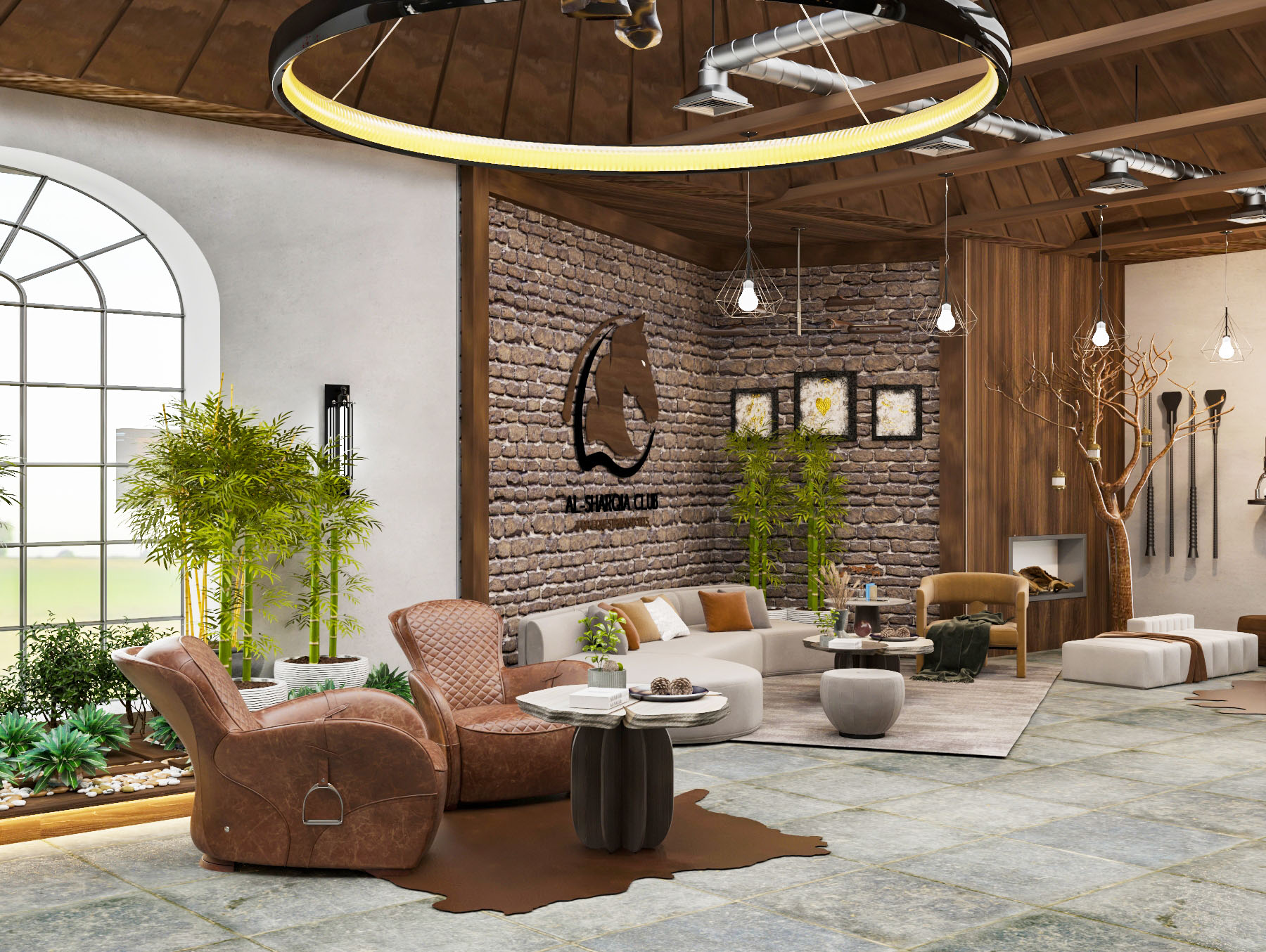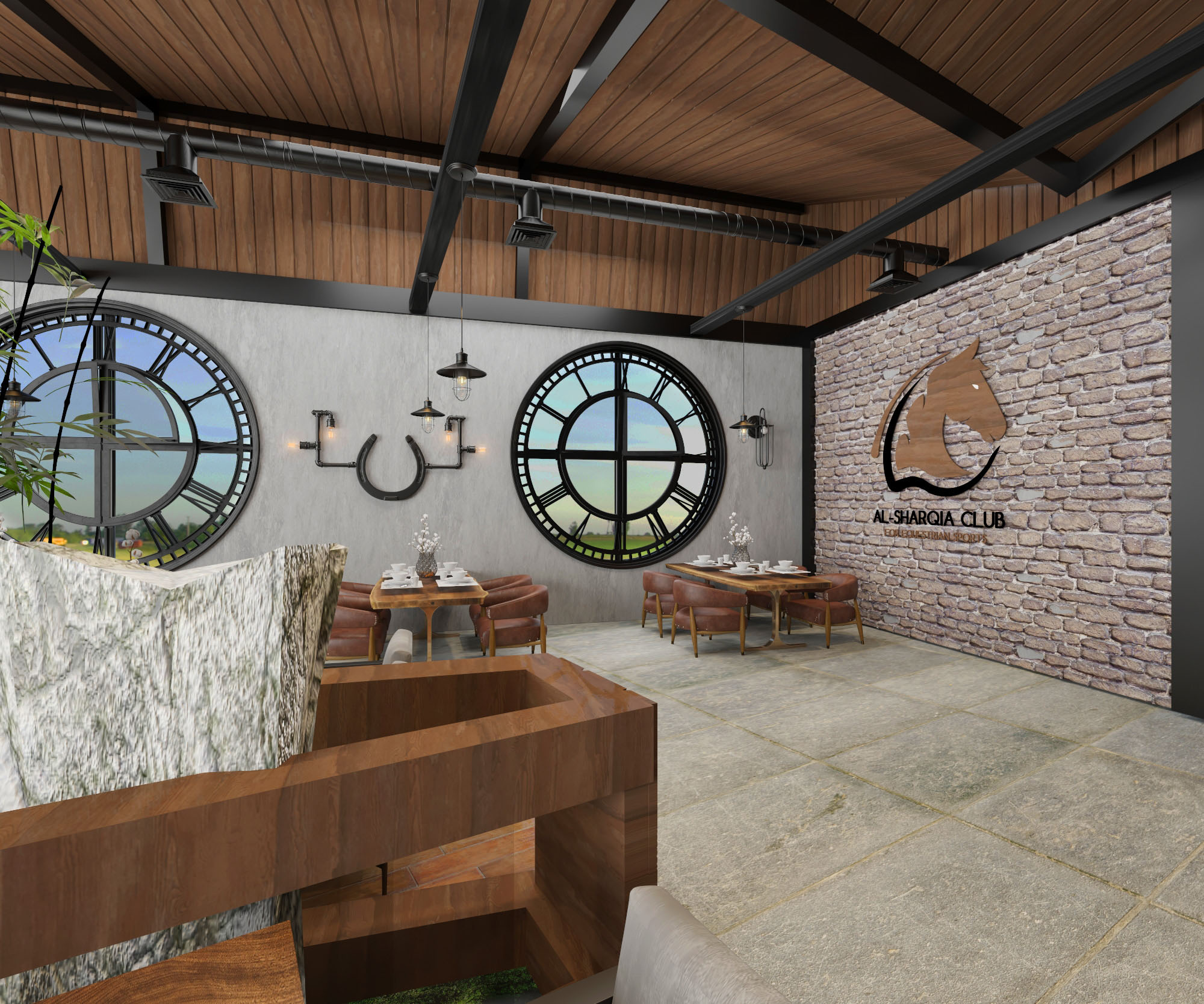 The project’s concept identifies to an authentic atmosphere which reflects horse stables by using natural materials like (wood, bricks, stones, natural leather and metal) with the combination of warm colors to make a soothing mood. Furthermore, the usage of horses’ equipment and tools in the design of the club reflects the mood of the stable. Also the usage of Al-Sharqia materials to achieve the place identity.