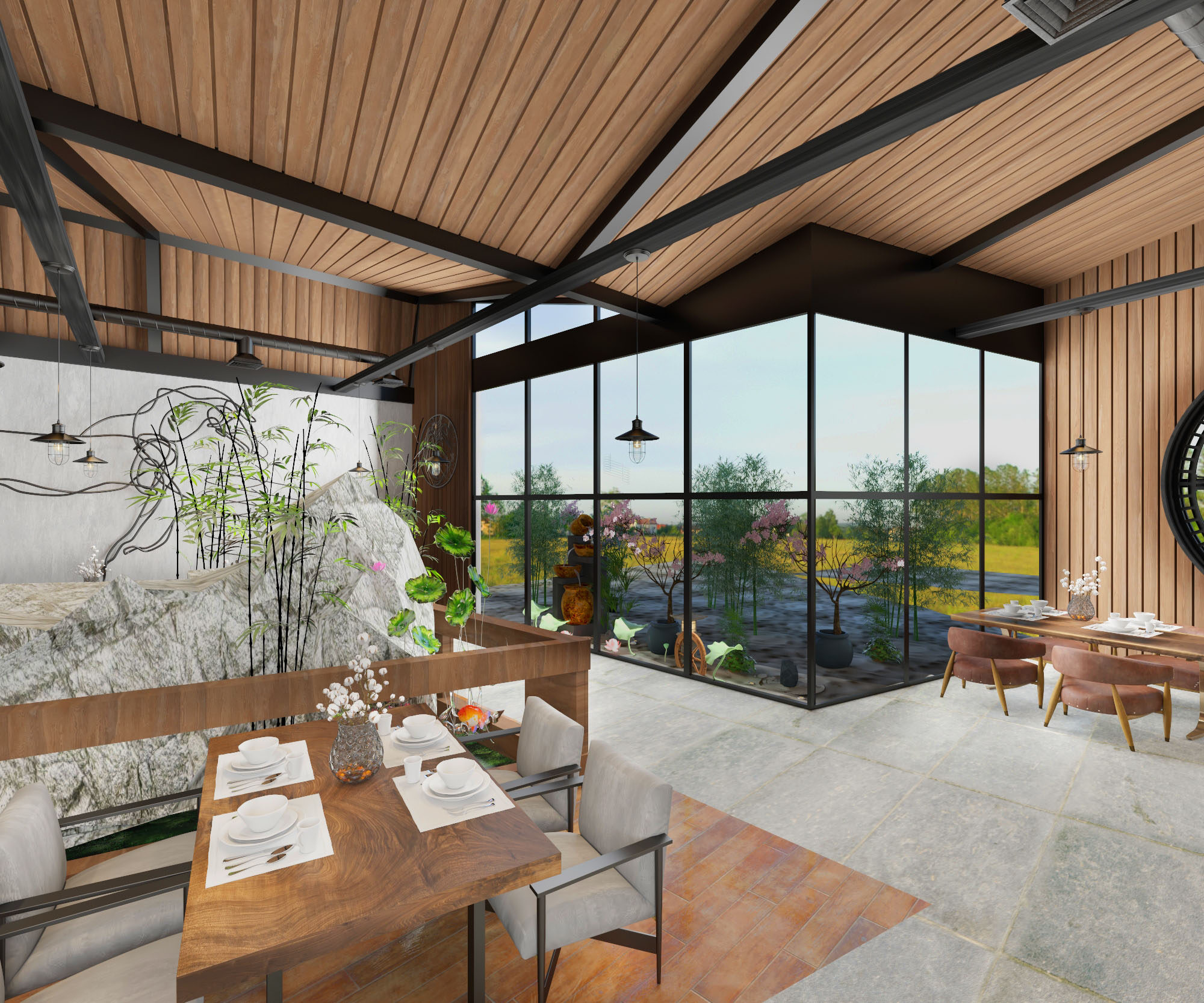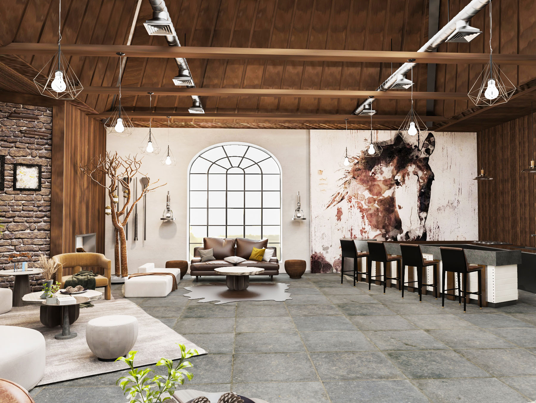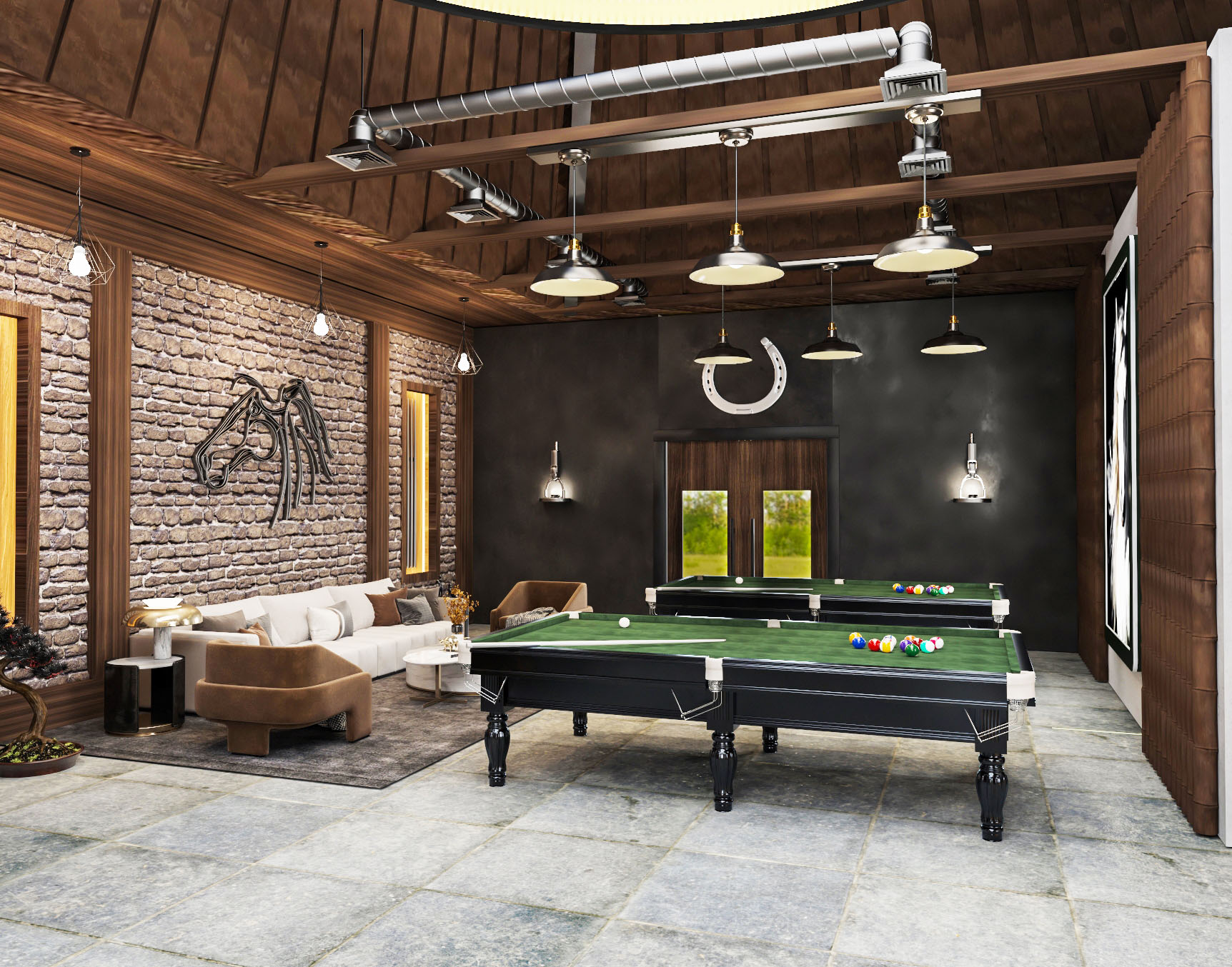 The project’s concept identifies to an authentic atmosphere which reflects horse stables by using natural materials like (wood, bricks, stones, natural leather and metal) with the combination of warm colors to make a soothing mood. Furthermore, the usage of horses’ equipment and tools in the design of the club reflects the mood of the stable. Also the usage of Al-Sharqia materials to achieve the place identity.