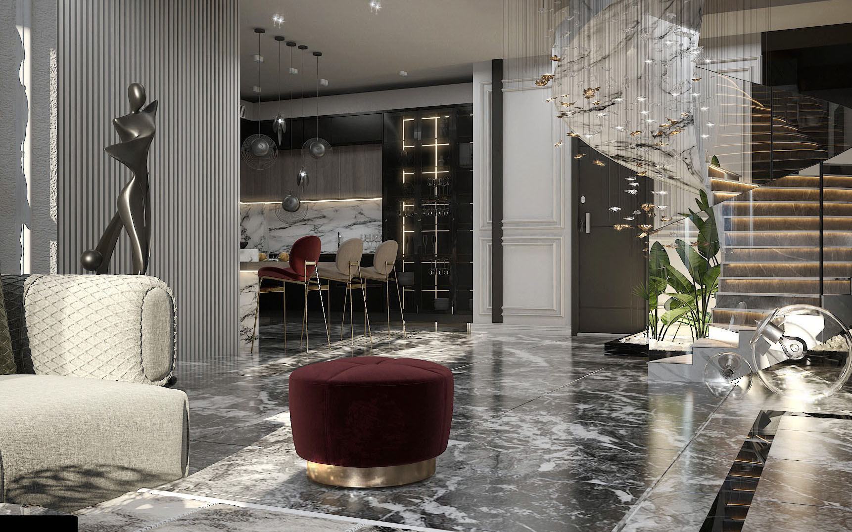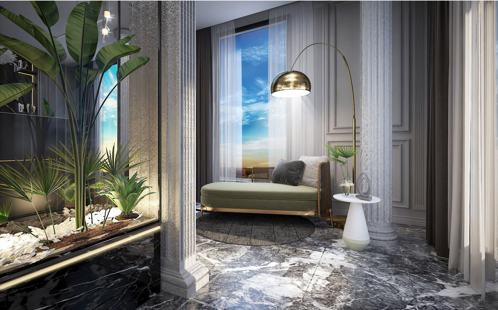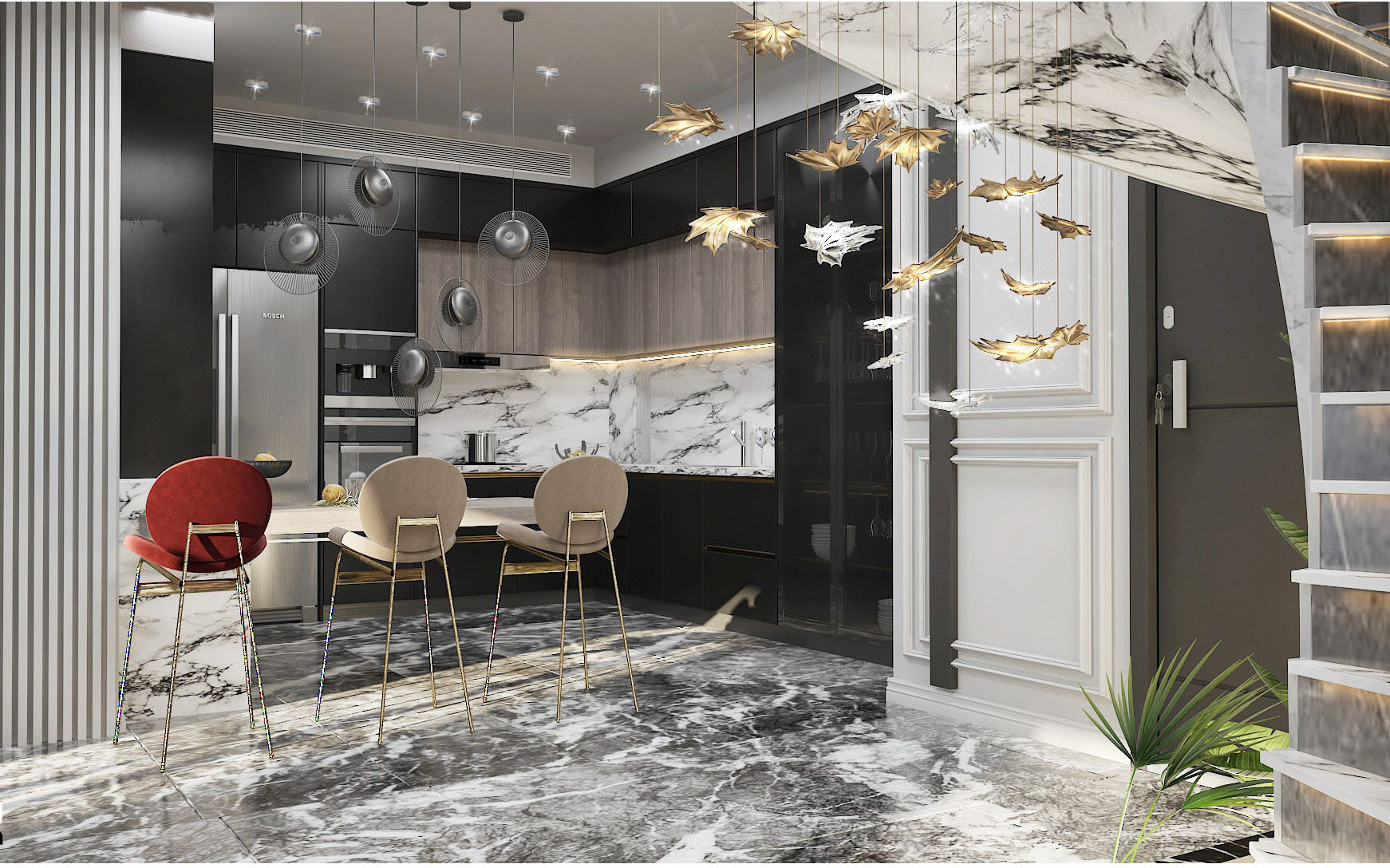 160 meter- The luxurious apartment was renovated in an neo-classic style. Landscaping, American kitchen modeling, ceiling repairs, wooden door polishing, toilet renovation, interior and exterior paintings, fencing, and flooring were all expertly renovated.